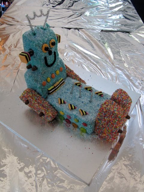Yet another brilliant party from down under! How great are these homemade robot costumes and cake? I love the idea of covering the table with foil for this themed party- very smart. (And thanks to Leonie for sharing).